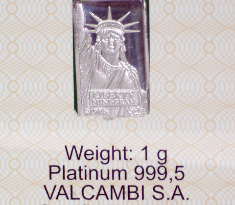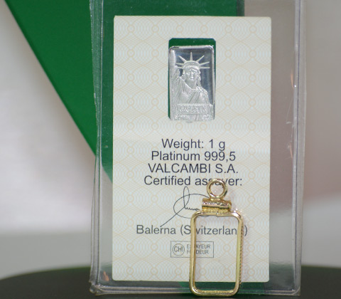 Платиновый слиток в золотой оправе Вашему вниманию предлагается платиновый слиток весом 1г. эмитированный швейцарским банком "Credit Suisse" и оправа для него из желтого золота 14 карат (583 проба). Чистота металла 999.5 Размеры слитка15 х 9 х 0,7 мм. Слиток крепится в рамке при помощи винтового соединения и может быть легко вынут при желании. В комплекте разъемное кольцо для легкого продевания цепочки. Вес рамки 0,76 г. По Вашему желанию, может быть выслан в собранном виде или по отдельности. Отличный оригинальный подарок, стильное украшение и удачная инвестиция в одном изделии! |