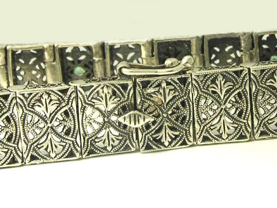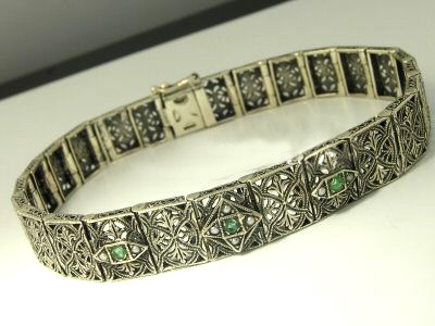 Филигранный браслет с изумрудами и жемчугом Вашему вниманию предлагается браслет, выполненый в стиле арт-деко, из стерлингового серебра (925 проба) с изумрудами и жемчугом! Три изумруда диаметром 2 мм и восемь жемчужин диаметром 1,5 мм прекрасно вписываются в филигранную вязь украшения. Длина браслета 180 мм, ширина 10,5 мм. Вес изделия 18,5 г. |
