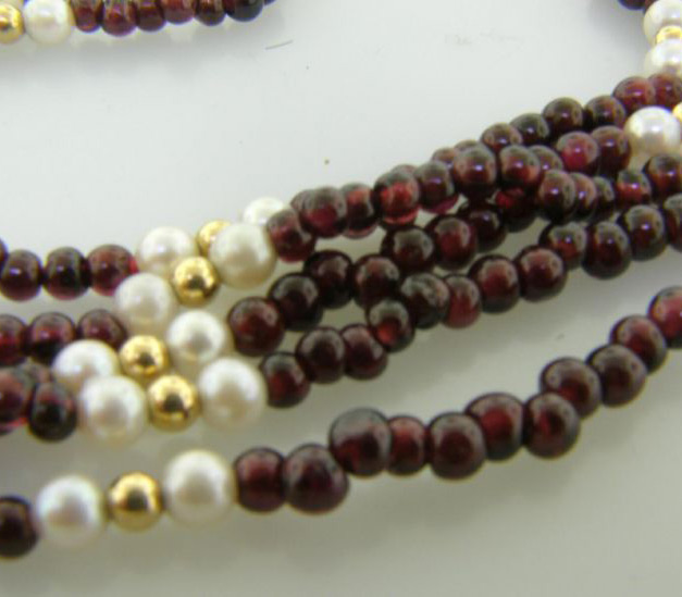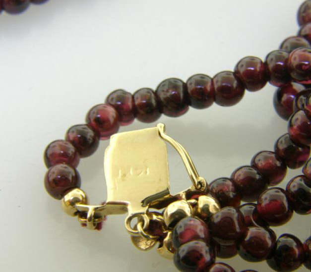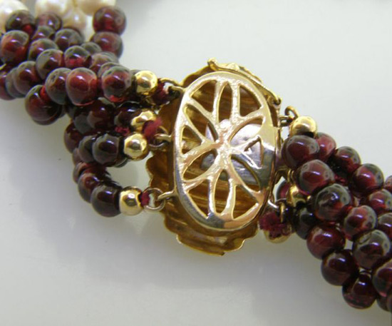 Антикварное колье с гранатами и жемчугом Вашему вниманию предлагается великолепное антикварное украшение — колье в 5 нитей с 540 бусинами пурпурного граната диаметром 4,8 мм, 80 жемчужинами диаметром 5 мм, разделенными 4-х миллиметровыми бусинами из 14-каратного желтого золота! Застежка выполнена из 14-каратного золота (585 проба). Длина колье 475 мм. Вес 98,3 г. Начало 50-х годов прошлого века. Сделано в Испании. Состояние идеальное. |