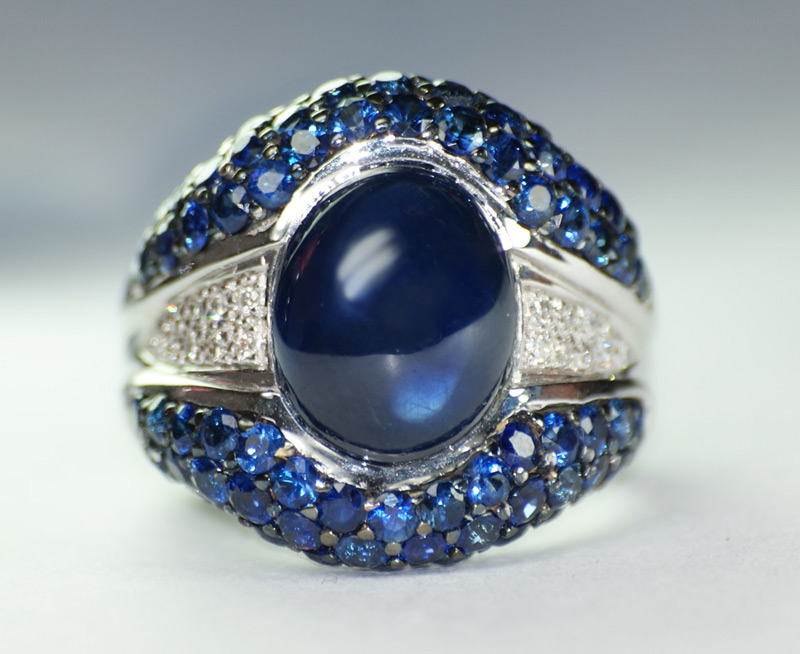Роскошное кольцо из 18-каратного золота (750 проба) с сапфирами и бриллиантами! В центре — сапфир-кабошон с эффектом кошачьего глаза 12 х 10 мм, по периметру — сапфиры диаметром 2 мм и бриллианты диаметром 1 мм. Вес 14,8 г. Размер 17. Кольцо имеет российский сертификат. Экспертная оценка $2642. Ниже приводятся ювелирные характеристики вставок