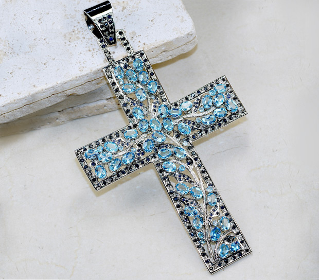 Эксклюзив! Крест с голубыми топазами и иолитами Вашему вниманию предлагается авторская работа — кулон в форме креста из стерлингового серебра (925 проба) с голубыми топазами и иолитами! Дизайн: Kristy Patterson. Суммарный вес камней 500 карат! Размеры камней от 1 мм до 7 х 5 мм. Размеры кулона с петлей 153 х 89 мм. Вес изделия 70,4 г. | ![]() |