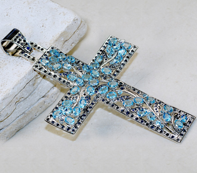 Эксклюзив! Крест с голубыми топазами и иолитами Вашему вниманию предлагается авторская работа — кулон в форме креста из стерлингового серебра (925 проба) с голубыми топазами и иолитами! Дизайн: Kristy Patterson. Суммарный вес камней 500 карат! Размеры камней от 1 мм до 7 х 5 мм. Размеры кулона с петлей 153 х 89 мм. Вес изделия 70,4 г. |
