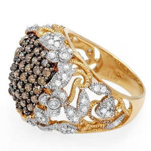 Кольцо с шоколадными бриллиантами Вашему вниманию предлагается кольцо из 10-каратного золота (417 проба) с 45 шоколадными бриллиантами (цвет С2–С3, чистота SI3) весом 1,06 карат и 70 белыми бриллиантами (цвет G, чистота I1–I2) весом 0,54 карат. Ширина площадки 19 мм, высота 95 мм. Вес изделия 8 г. Размер 17,25. |