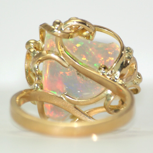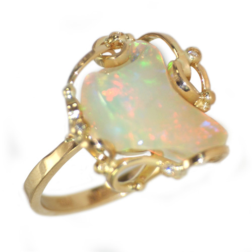 Эксклюзив! Ажурное кольцо с белым опалом и бриллиантами Вашему вниманию предлагается эксклюзивное украшение от компании «Серебряные Линии» — кольцо с красивейшим белым опалом и бриллиантами в ажурной авторской оправе из желтого золота 750 пробы! Опал переливается зеленым, оранжевым и желтым цветами. Ширина площадки 21,5 мм, высота 10 мм. Вес изделия 7,56 г. Размер 17,75. Кольцо имеет российский сертификат. Экспертная оценка $861.