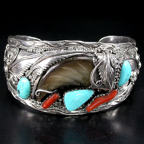 Браслет в стиле NAVAJO с когтем барсука, бирюзой и кораллом Вашему вниманию предлагается уникальная авторская работа - браслет из стерлингового серебра (925 проба) с когтем барсука, ярко-голубой бирюзой и кораллом! Браслет выполнен в стиле NAVAJO. Внутренняя окружность 180 мм. Можно слегка уменьшить или увеличить, поджав или отжав дуги. Максимальная ширина 37 мм. Вес 58,2г. 100% ручная работа! | ![]() |