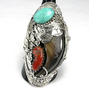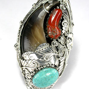 Кольцо в стиле NAVAJO с когтем барсука, бирюзой и кораллом Вашему вниманию предлагается уникальная авторская работа - кольцо из стерлингового серебра (925 проба) с когтем барсука, ярко-голубой бирюзой и кораллом! Кольцо выполнено в стиле NAVAJO. Размеры площадки 50 х 25 мм. Вес 20,9г. Размер 18,5. 100% ручная работа! |
