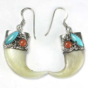 Серьги в стиле NAVAJO с когтем барсука, бирюзой и кораллом Вашему вниманию предлагается уникальная авторская работа - серьги из стерлингового серебра (925 проба) с инкрустацией когтем барсука, ярко-голубой бирюзой и кораллом! Серьги выполнены в стиле NAVAJO. Размеры с петлей 40 х 12 мм. Вес пары 4,6г. 100% ручная работа! | ![]() |