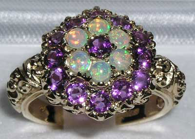 Золотое кольцо с опалами и аметистами Вашему вниманию предлагается авторское кольцо из желтого золота 9 карат (375 проба) с высочайшего качества австралийскими белыми опалами и ярко-сиреневыми аметистами! В кольце 6 опалов категории Brightness A+++ и 13 чистейших аметистов диаметром 3 мм. Ширина площадки 15 мм, высота 6 мм. Вес изделия 6,5 г Кольцо на размер 18. Сделано в Англии. | ![]() |