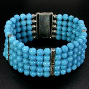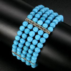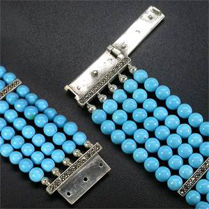 Браслет в 5 нитей с небесно-голубой бирюзой Вашему вниманию предлагается браслет из стерлингового серебра (925 проба) с 5 нитками небесно-голубой бирюзы (США, Аризона)! Пряжка и перемычки украшены маркаситами! Длина браслета 190 мм, ширина 27 мм. Диаметр бирюзы 5,5 мм. Вес изделия 42,3 г. |
