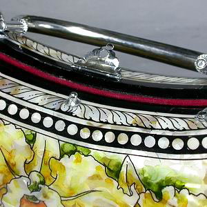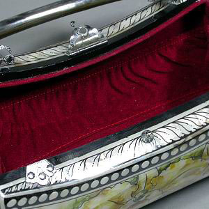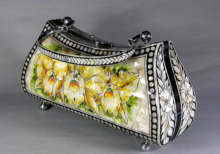 Сумочка "Три Орхидеи"! Ручная работа Вашему вниманию предлагается авторская работа – сумочка, инкрустированная натуральным радужным цветным перламутром. Великолепная ручная работа! Снизу прикреплены 4 металлических ножки-шарика. Жесткая ручка инкрустирована перламутром. Надежный стальной замок-застежка. Изнутри оформлена темно-красной бархатной тканью, имеет 2 внутренних боковых кармана во всю длину. Перламутр защищен лаковым покрытием. Отличный подарок!
