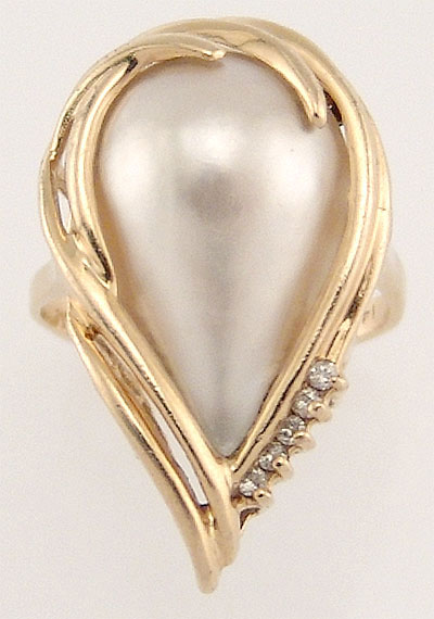 Кольцо с жемчугом Mabe и бриллиантами Вашему вниманию предлагается авторское кольцо из желтого золота 14 карат (585 проба) с великолепным жемчугом Маве (жемчуг, выращенный на пластине перламутра) и пятью бриллиантовыми акцентами! Размер жемчуга 20 х 12 мм. Размеры площадки 27,5 х 16 мм, высота 9,5 мм. Вес изделия 5,9 г Кольцо на размер 16,75. Кольцо изготовлено ориентировочно в 60-х годах прошлого века. Состояние превосходное. | ![]() |