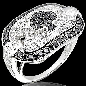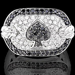 Кольцо "Масть" с бриллиантами Вашему вниманию предлагается авторское кольцо «Масть» из белого золота 9 карат (375 проба) с черными и белыми бриллиантами! Родиевое покрытие. Размеры площадки 25 х 15 мм, высота 4,5 мм. Вес изделия 7,63 г Кольцо на размер 18. Есть заключение ювелирной экспертизы. Экспертная оценка (без учета НДС и консигнационной наценки) $780.