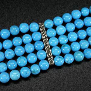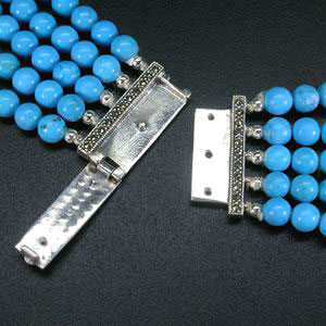 Колье в 5 нитей с небесно-голубой бирюзой Вашему вниманию предлагается колье из стерлингового серебра (925 проба) с 5 нитками небесно-голубой бирюзы (США, Аризона) разной длины! Пряжка и перемычки украшены маркаситами! Длина по самой короткой нитке 457 мм, по самой длинной – 584 мм, ширина 30 мм. Диаметр бирюзы 5,5 мм. Вес изделия 130 г. |