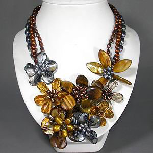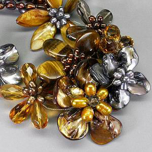 Колье с "цветками" из перламутра, цитринов, тигрового глаза и жемчуга Вашему вниманию предлагается великолепное авторское украшение – колье с цитринами, тигровым глазом, перламутром и жемчугом разных сортов!