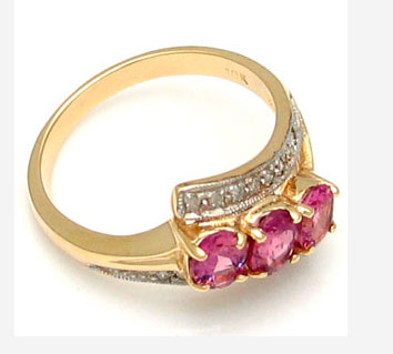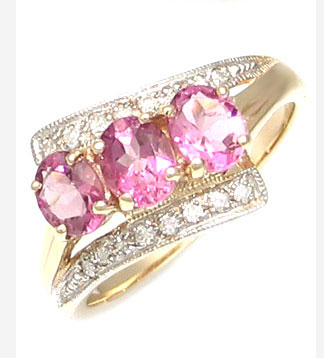 Кольцо с розовыми турмалинами и бриллиантами Вашему вниманию предлагается кольцо из золота 375 пробы с розовыми турмалинами и бриллиантами! Три розовых турмалина овальной огранки размерами 5 х 4 мм и 16 натуральных бриллиантовых акцентов! Вес изделия 2,8г. Кольцо на размер 17. |