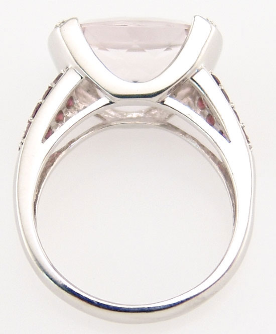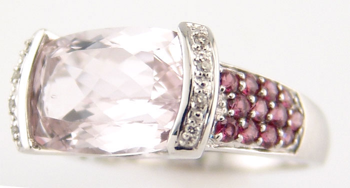 Превосходное кольцо с кунцитом, турмалинами и бриллиантами Вашему вниманию предлагается кольцо из белого золота 14 карат (585 проба) с чистейшим нежно-розовым кунцитом, пурпурно-красными турмалинами и бриллиантами! Размеры кунцита 15 х 10 мм. Высота площадки 10 мм. Вес изделия 10,2г. Размер 19,5. Кольцо сертифицировано. Экспертная оценка $527 |