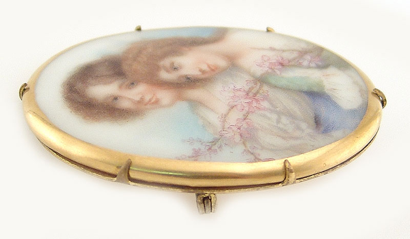 Антикварная брошь с портретом Вашему вниманию предлагается антикварная брошь с портретом двух девушек, выполненных красками по фарфору! 100% ручная работа! Предположительно, конец 19 – начало 20 веков. Фарфоровый овал лежит на металлической пластине, к которой крепится застежка. Позолота. Размеры броши 54 х 41 мм. Вес изделия 24,1 г. Украшение в отличном состоянии – только незначительные потертости с оборотной стороны. |