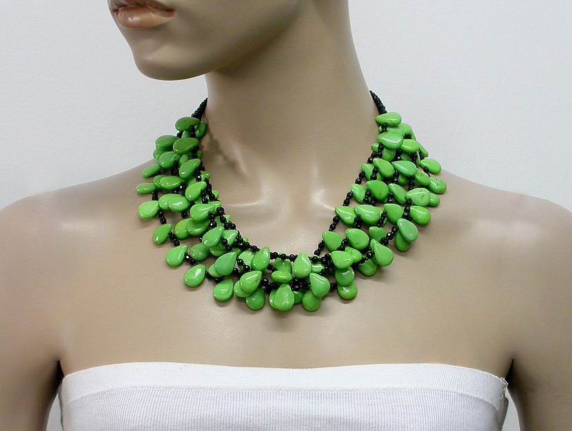 Колье состоит из 5 нитей с бусинами черного оникса диаметром 3 – 4 мм и «каплями» яркой зеленой бирюзы размерами примерно 16 х 12 мм! Общая длина 500 мм. Застежка выполнена из серебра 925 пробы. Вес украшения 190 г. | ![]() |