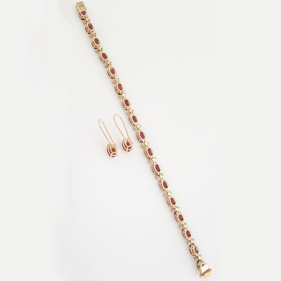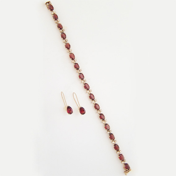 Комплект с гранатами Вашему вниманию предлагается комплект (браслет + серьги) из 14-каратного золота (585 проба) с гранатами и бриллиантами! Вес комплекта 14,2 г. Браслет: 17 гранатов размерами 7 х 5 мм и 34 бриллианта диаметром 2 мм (цвет 3, чистота 4 -7)! Длина 185 мм, ширина 5 мм. Серьги: камни каплевидной формы размерами 8 х 5 мм. Размеры серег 22 х 5 мм. |