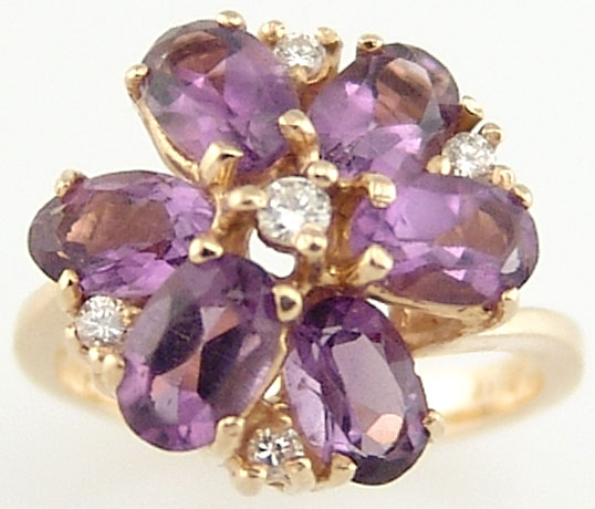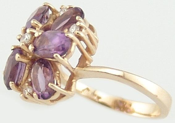 Кольцо с аметистами и бриллиантами Вашему вниманию предлагается кольцо из 14-каратного золота (585 проба) с шестью аметистами размерами 6 х 4 мм и пятью бриллиантами диаметром от 1,5 мм до 2 мм! Высота площадки 9 мм. Вес изделия 4,3 г. Размер 15,75. |