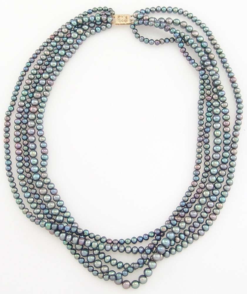 Колье с радужным жемчугом Вашему вниманию предлагается великолепное украшение – колье с жемчугом! Колье выполнено из 5 нитей радужного жемчуга диаметром 4 – 6 мм! Общая длина 475 мм. Застежка из 14-каратного золота (585 проба). Вес украшения 67,9 г. |