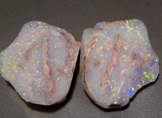 Размеры половинок 26 х 31 х 6 мм. Многоцветная опалесценция. Яркость по пятибалльной шкале 4!