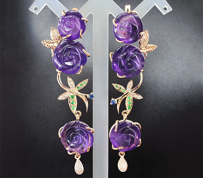 | Cерьги с резными аметистами, цаворитами гранатами и сапфирами!