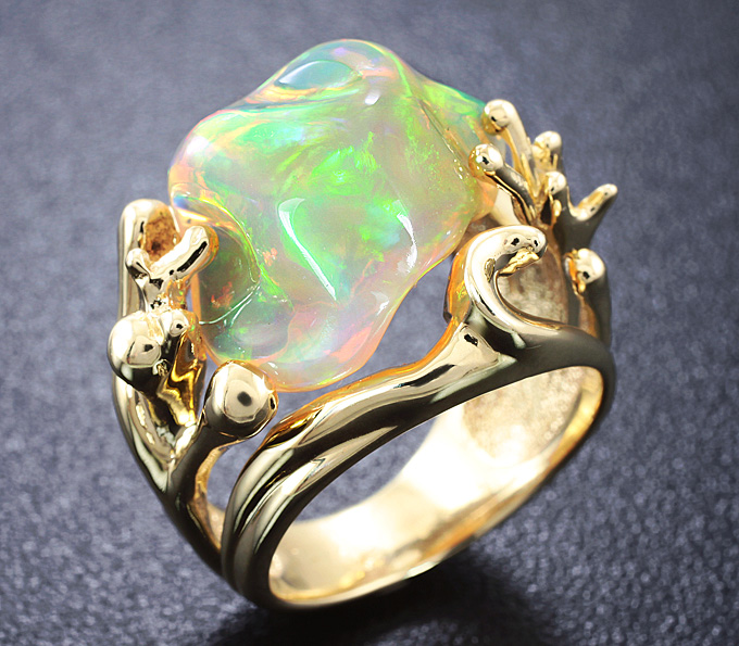 Лот № m-1059 Кольцо с эфиопским опалом! Материал: Золото Вес изделия: 11,9 грамм Размер: 16 (Не подходит размер?) Вашему вниманию предлагается кольцо из золота 585 пробы с эфиопским опалом! Основные цвета опалесценции: красный, желтый и зеленый. Площадка 23 х 18 мм, высота 10 мм. Вес изделия 11,9 г. Размер 16. Ниже приводятся ювелирные характеристики вставки.