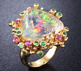 | Кольцо с крупным ограненным кристаллическим Welo опалом, цаворитами и розовыми сапфирами!
