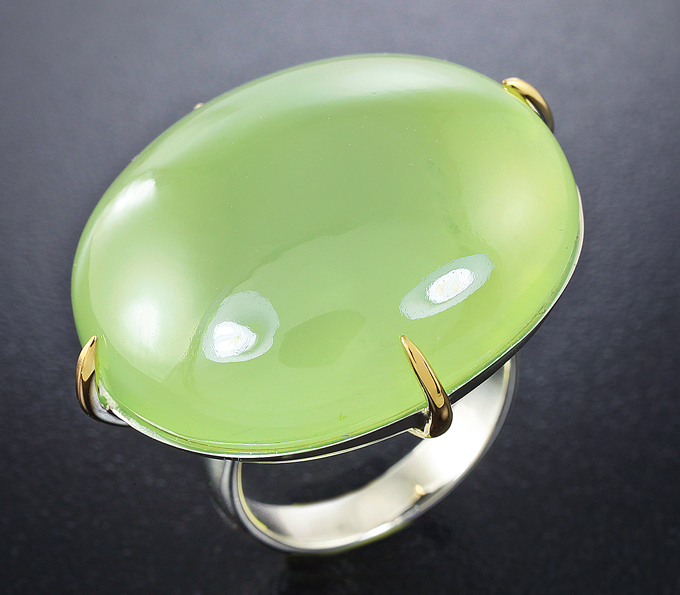 Лот № m-1745 Кольцо c крупным пренитом! Материал: Серебро 925 Вес изделия: 19,8 грамм Размер: 17 (Не подходит размер?) Вашему вниманию предлагается кольцо из стерлингового серебра (925 проба) c крупным пренитом! Изделие частично позолочено. Размеры вставки 27 х 23 мм. Площадка 30 х 26 мм, высота 14 мм. Вес изделия 19,8 г. Размер 17. Ниже приводятся ювелирные характеристики вставки.