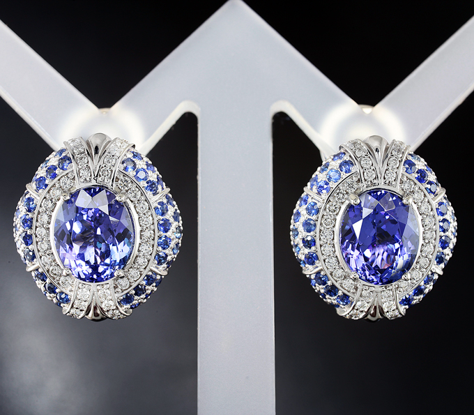Вашему вниманию предлагаются серьги из белого золота 585 пробы с танзанитами, бриллиантами и синими сапфирами! Размеры вставок от 1,1 мм до 9,65 х 7,81 х 5,81 мм. Площадка серег 19 х 17 мм. Вес пары 13,1 г.
