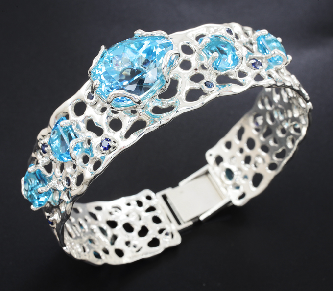 Лот № m-3311 Браслет с голубыми топазами и синими сапфирами! Материал: Серебро 925 Вес изделия: 63 грамм Размер: 220 мм Вашему вниманию предлагается браслет из стерлингового серебра (925 проба) с голубыми топазами и синими сапфирами! Изделие частично позолочено. Диаметр дополнительной инкрустации от 2,5 мм до 3 мм. Длина браслета по внутренней окружности 220 мм, ширина 21 мм. Вес изделия 63 г. Отзывы покупателей
