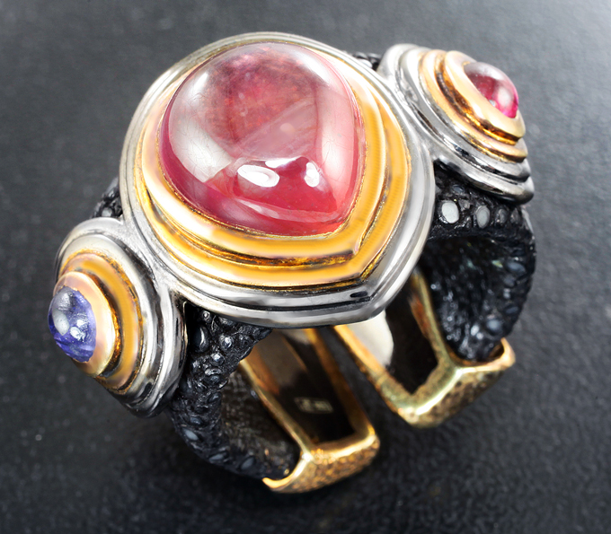 Кольцо из кожи ската и серебра с красными сапфирами и иолитом!Магазин // Эксклюзив серебро // Кольца