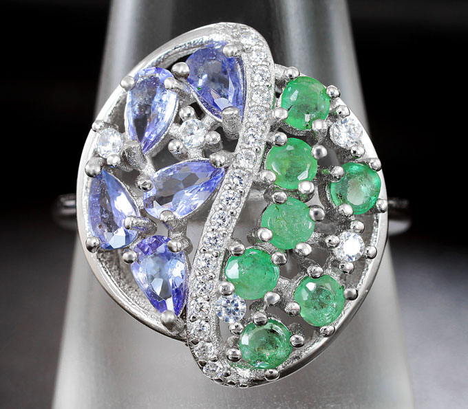 Изящное серебряное кольцо с изумрудами и танзанитами!Магазин // Rabhasa Venudary // Кольца