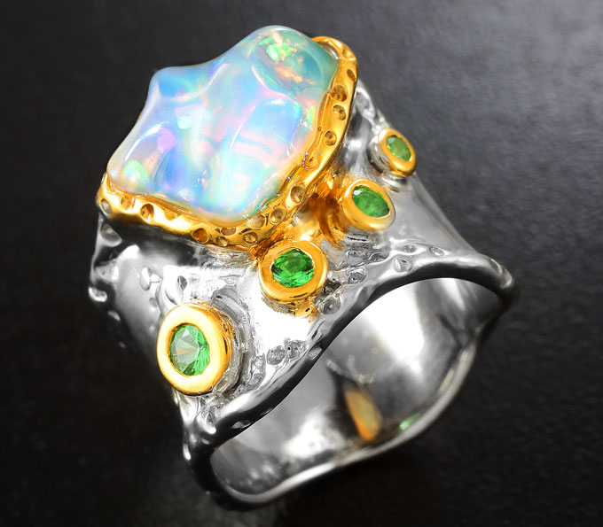 Серебряное кольцо с кристаллическим эфиопским опалом и цаворитами!