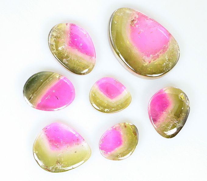 Вашему вниманию предлагается набор из 7 слайсов «арбузных» турмалинов! Ниже приводятся ювелирные характеристики вставок.