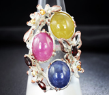 Серебряное кольцо с разноцветными сапфирами и мозамбикскими гранатами!Магазин // Эксклюзив серебро // Кольца