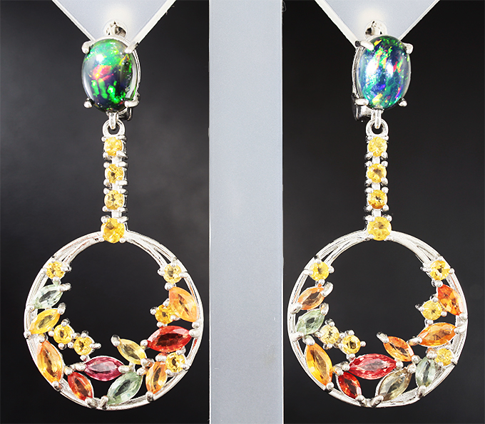 Серебряные серьги с кристаллическими черными опалами и разноцветными сапфирами!Магазин // Rabhasa Venudary // Серьги