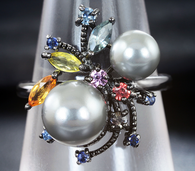 Изысканное серебряное кольцо с жемчугом и разноцветными сапфирами!Магазин // Rabhasa Venudary // Кольца