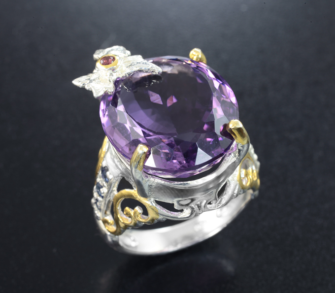 Серебряное кольцо с аметистом, синими сапфирами и родолитами!Магазин // Эксклюзив серебро // Кольца