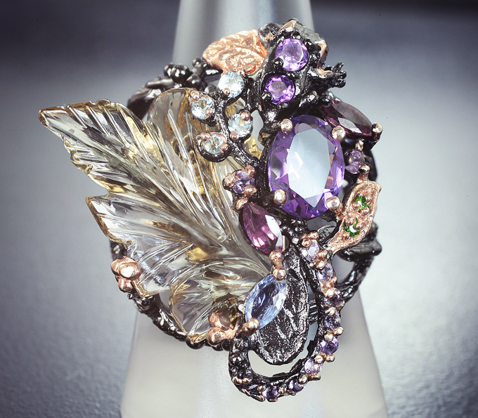 Серебряное кольцо с резным цитрином, аметистами, голубыми топазами, родолитами, диопсидами и танзанитом!Магазин // Эксклюзив серебро // Кольца