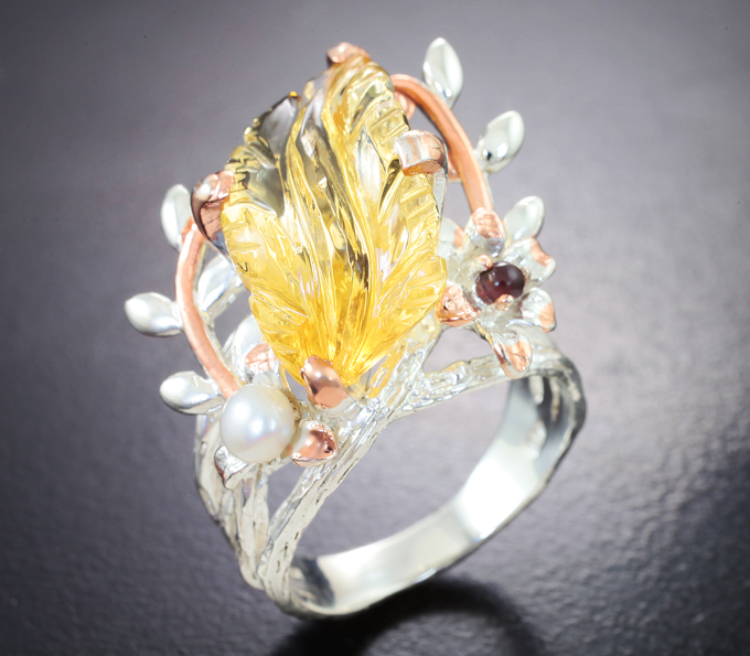 Серебряное кольцо с резным цитрином, жемчужиной и родолитом!Магазин // Эксклюзив серебро // Кольца