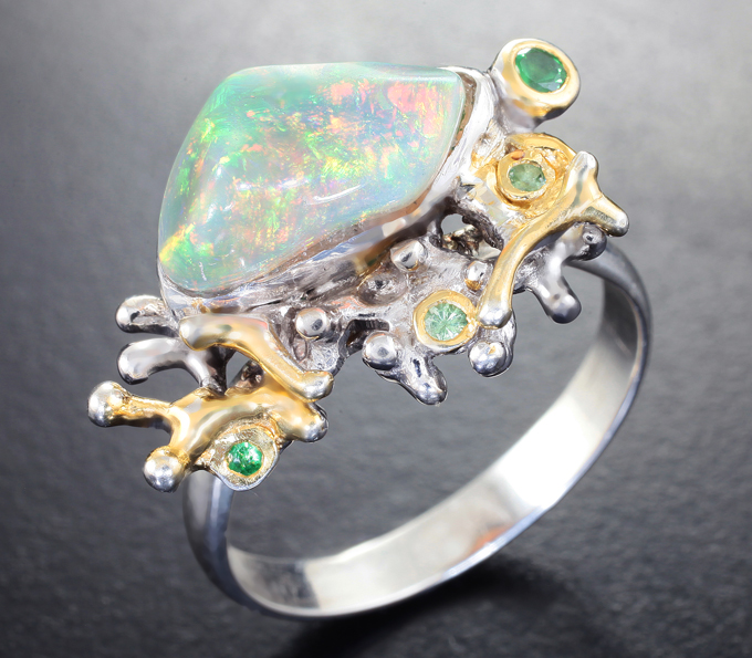 Серебряное кольцо с кристалическим эфиопским опалом и цаворитами!Магазин // Эксклюзив серебро // Кольца