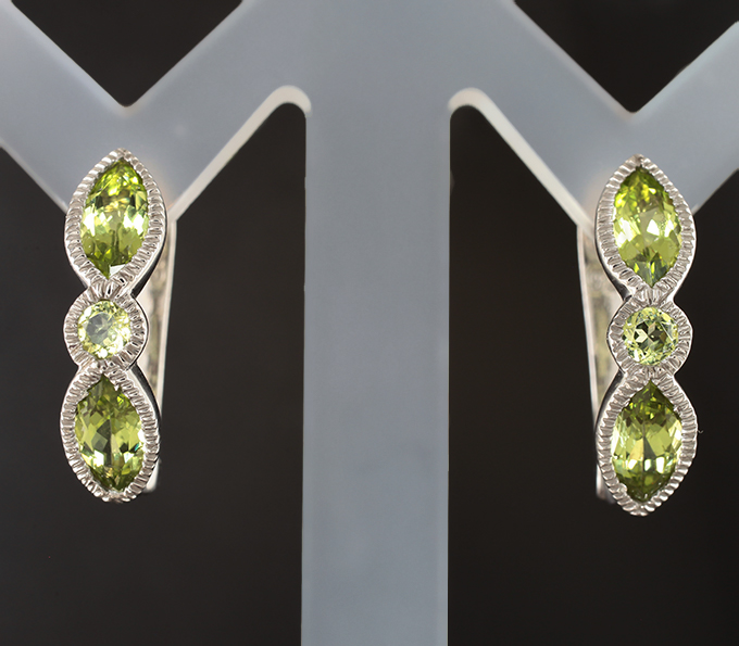 Лот № e-14701 Прелестные серебряные серьги с перидотами! Материал: Серебро 925 Вес изделия: 4,4 грамм Размер: 19 х 5 мм Вашему вниманию предлагаются серьги из стерлингового серебра (925 проба) с перидотами! Размеры вставок 3 мм и 8 х 4 мм. Площадка серег 19 х 5 мм. Вес пары 4,4 г. Отзывы покупателей