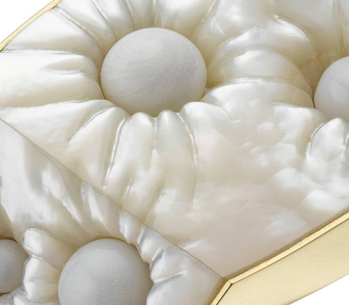 Новый браслет от авангардного греческого дизайнера Melanie Georgacopoulos из ее последней коллекции «Carats». Melanie продолжает экспериментировать с формами и материалами, чаще всего работая с самой аристократической драгоценностью — жемчугом. Этот браслет объединяет экологичное золото, переработанное из вторсырья с резным перламутром, который обволакивает индонезийский жемчуг вида Hippopus.