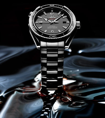 Omega выпусает часы на основе жидкого металла - Новости ювелирного мира.Магазин // Новости 21.10.2009 Omega выпусает часы на основе жидкого металла. Omega объявила о запуске Seamaster Planet Ocean Liquidmetal — первых в мире часов, в которых используется жидкий металл. Специалисты Swatch Group и Омега создали новый керамический безель, индикаторы и шкала на котором изготовлены из сплава жидкого металла, что визуально проявляется в потрясающем серебристом цвете, выразительно отличающимся от черного керамического фона. В свою очередь, цвет керамического циферблата идеально сочетается с цветом безеля. Такой результат стал возможным только благодаря нескольким новаторским процессам. Модель выпущена лимитированной серией в количестве 1948 экземпляров — в честь года, когда Omega запустила популярную линию часов Seamaster. Сплав жидкого металла (Liquidmetal) представляет собой аморфный металлический материал с неупорядоченной, не атомно-кристаллической структурой. Его температура плавления составляет половину от обычных сплавов титана, а при охлаждении его твердость в три раза больше, чем у нержавеющей стали. Аморфная структура позволяет ему легко соединяться с керамическим безелем, который, в результате, получается совершенно гладким и очень устойчивым к царапинам и коррозии. Технология изготовления безеля следующая. Сначала формируется керамическое кольцо-безель. Цифры и риски на поверхности безеля гравируются, затем он полируется. Сплав жидкого металла нагревают и прессуют в выгравированные полости в керамическом материале, после чего удаляют излишки сплава. Поскольку сплавом жидкого металла можно манипулировать при более низкой температуре, чем температура нагрева металлов, обычно используемых в часовом деле, использование такого процесса не приводит к повреждению керамического материала.
