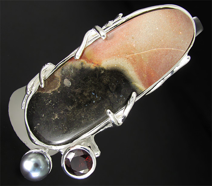 Кольцо с брекцией агата, кварцита и яшмы, гранатом и цветной жемчужиной