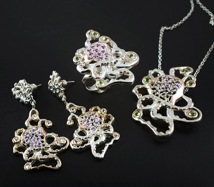 Лот № ea-1729 Комплект с перидотами и аметистами! Материал: Серебро 925 Вес изделия: 33 грамм Размер: 17+ Вашему вниманию предлагается комплект (кольцо + серьги + кулон + цепочка) из стерлингового серебра (925 проба) с перидотами и аметистами! Изделия частично текстурированы и позолочены. Диаметр вставок от 2 мм до 3 мм. Вес комплекта 33 г. Кольцо: площадка 35 х 25 мм, высота 5 мм. Вес 10,8 г. Размер регулируемый: 17 и выше. Серьги: размеры с петлей 47 х 24 мм. Вес пары 11,5 г. Кулон: площадка 41 х 34 мм. Вес 10,7 г. Длина цепочки 420 мм. Возможно, в продаже есть другие Комплекты Аметист, Перидот, воспользуйтесь поиском по сайту. Комплекты GoldLip FactoryОтзывы покупателей Подобные лоты в продаже ![]() Проданные лоты