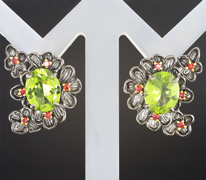 Серебряные серьги с перидотами и красно-оранжевыми сапфирами
