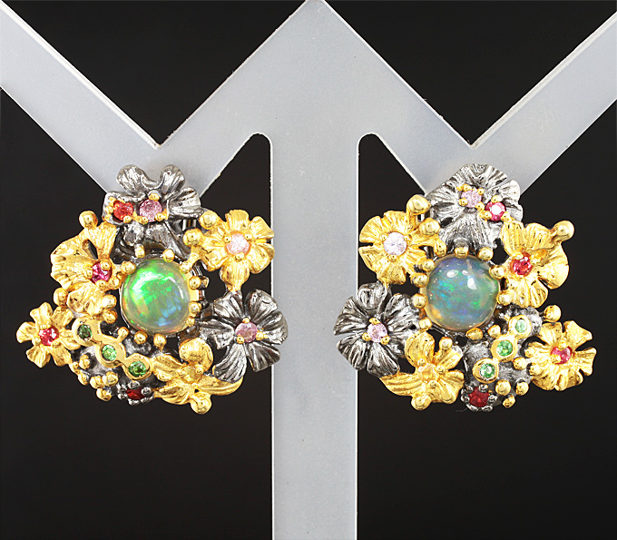 Серебряные серьги с эфиопскими опалами, цаворитами и разноцветными сапфирами